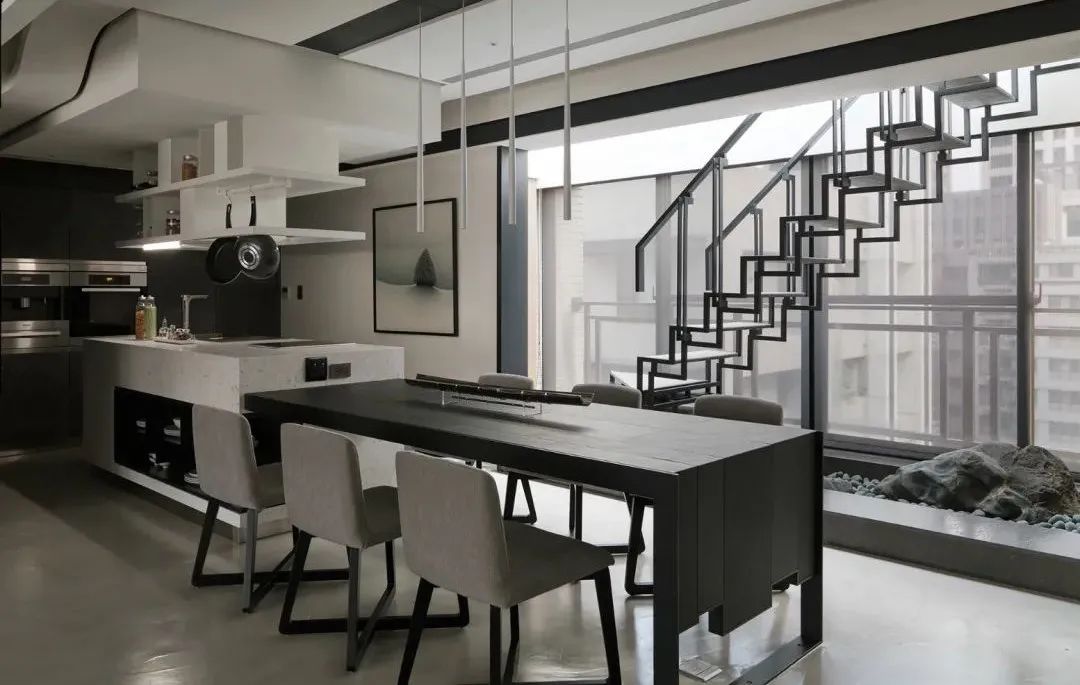 餐桌與島臺咬合的設計也是當下十分流行的選擇,臺面與餐桌的高低差增強了視覺的層次感,交接處做側插處理,“L”型結構與整體空間和諧共融,在功能上也更加多元。